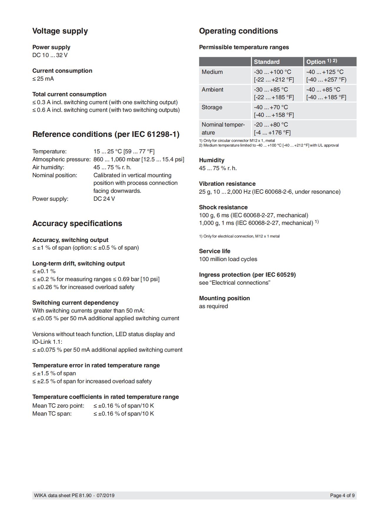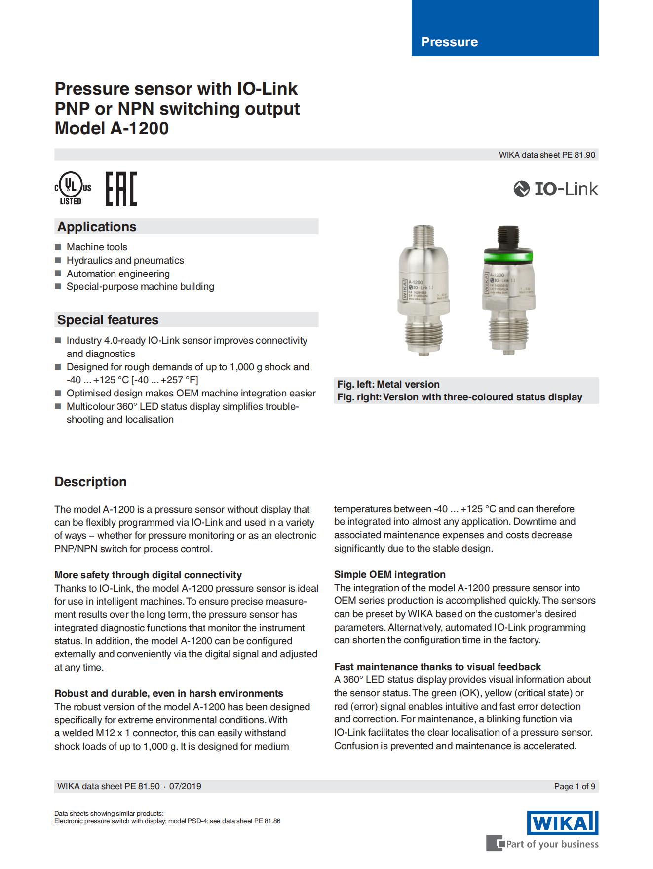 带有IO-Link的压力传感器 PNP或NPN开关输出 模型a - 1200